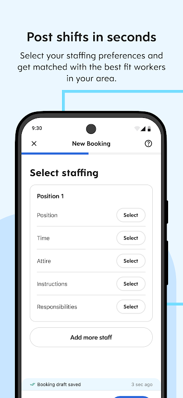 Búsqueda rápida: Reserva trabajadores confiables y calificados en tu área que se ajusten a tus requisitos de turno, preferencias y acreditaciones.