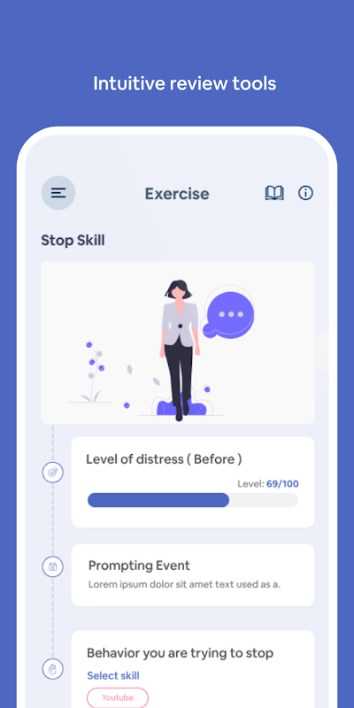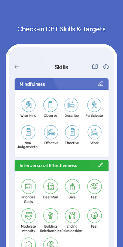Complete ejercicios y practique ideas que sean similares a las hojas de trabajo en el entrenamiento real de habilidades DBT. Hay más de 100 ejercicios. También puede ver un historial de todos los ejercicios que hizo en el pasado para comparar. Cada uno de los ejercicios se vincula directamente a las lecciones.
