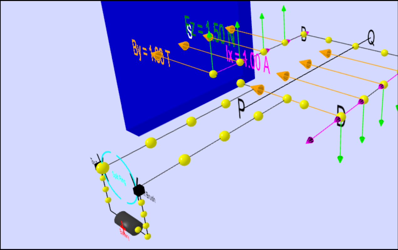 La clave para producir el movimiento se está posicionando el electroimán dentro del campo magnético del imán permanente (su campo se extiende desde el norte al polo sur). La armadura experimenta una fuerza descrita por la regla de la mano izquierda. Esta interacción de los campos magnéticos y se mueven las partículas cargadas (los electrones en los actuales) da como resultado la fuerza magnética (representado por las flechas verdes) que hace que el giro del inducido debido a la torsión. Utilice la corriente deslizante que permite ver lo que sucede cuando el flujo de corriente se invierte. La corriente de fluido y flujo de electrones casilla de verificación alows diferente visualización desde I = d (Q) / dt y Q = número de carga * e. El botón de reproducción y pausa permite congelar la vista 3D para la visualización de estas fuerzas, para la comprobación de la coherencia con la regla de la mano izquierda.