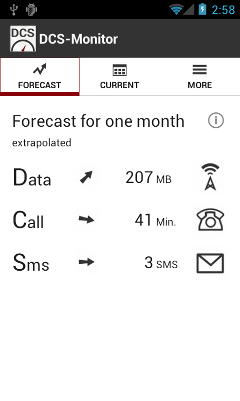 With the DSC-Monitor you can determine your monthly consumption of mobile Data, Calls/Talk-time and SMS and predict your future consumption (based on the data consumption over the last 4 months.)