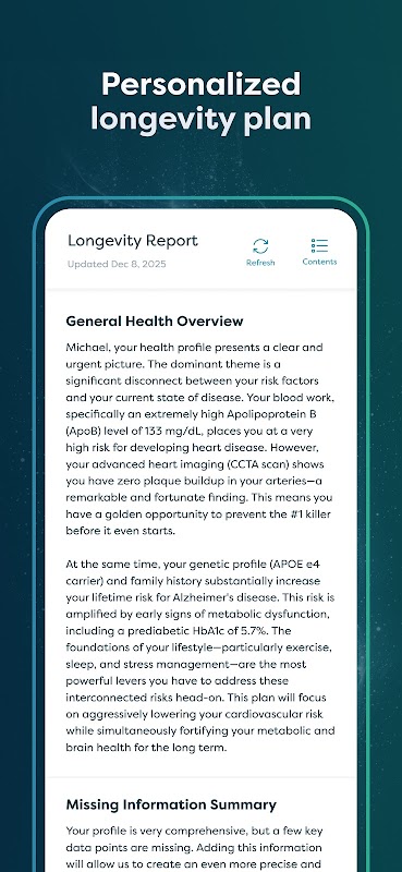 Comprende tu esperanza de vida actual a través de nuestro modelo de longevidad impulsado por IA, creado a partir de datos de los CDC, investigaciones de mortalidad global y datos sobre tu estilo de vida, como hábitos diarios y entrenamientos. Cada suscripción incluye análisis de sangre completos, que te brindan un conocimiento más profundo de biomarcadores clave como la presión arterial, el azúcar en sangre, los niveles hormonales, la glucemia en ayunas y la salud cardíaca, que influyen en tu salud general y tu esperanza de vida.