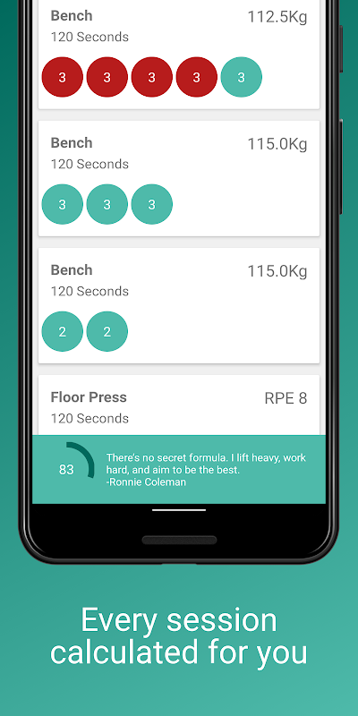 Esta aplicación generará ciclos para usted en función de su máximo de una repetición actual y le permitirá realizar un seguimiento de su progreso en cada sesión y semana. Se almacena un historial completo de sus ciclos completados y puede ver su creciente potencia en el press de banca en un gráfico.