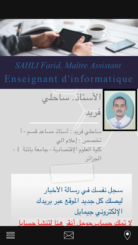 يتيح لك هذا التطبيق التواصل المباشر والمستمر من هاتفك النقال بالموقع الإلكتروني للأستاذ ساحلي فريد - كلية العلوم الإقتصادية - جامعة باتنة - الجزائر.