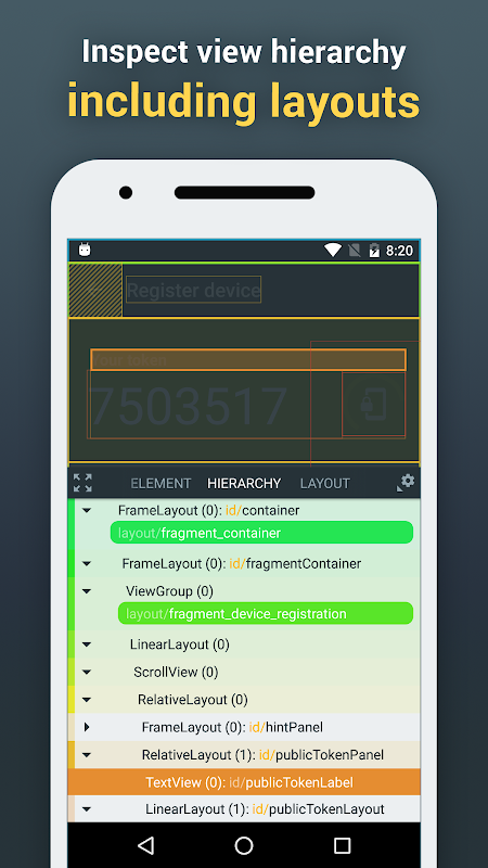 Los evaluadores que escriben pruebas automatizadas y los desarrolladores que buscan errores pueden inspeccionar la jerarquía de elementos que se muestran en la pantalla, directamente desde el dispositivo móvil. El concepto es similar a la inspección de páginas web con las conocidas herramientas de desarrollo incluidas en los principales navegadores web.