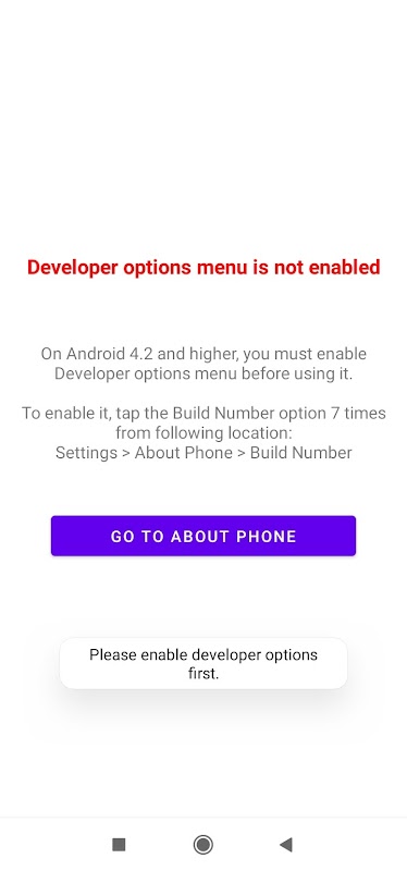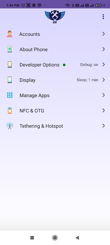 -> Acceso directo para Opciones de desarrollador con función inteligente, que solicita al usuario que habilite las opciones de desarrollador proporcionando acceso directo e instrucciones para ello (si está deshabilitado), y también muestra el estado de depuración de USB