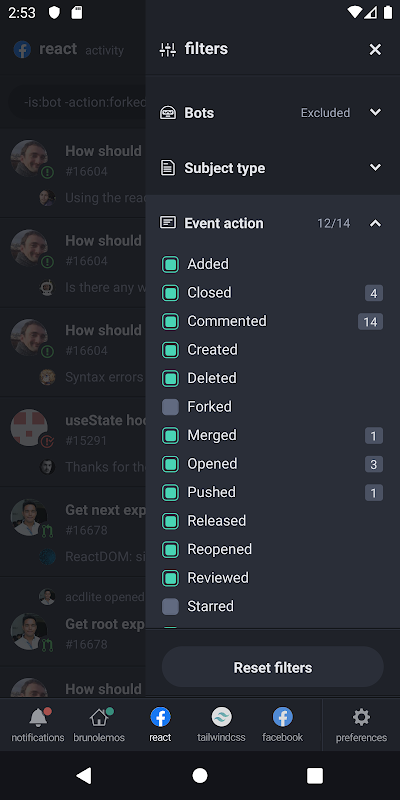 DevHub facilita el seguimiento de actividades desde múltiples repositorios. Puede crear una "columna" para cada uno, agregar filtros, guardar elementos para más adelante, etc. le ayuda a administrar las notificaciones de GitHub y mantenerse al tanto de las actividades del repositorio. También puede buscar problemas y solicitudes de extracción, administrar notificaciones y más.