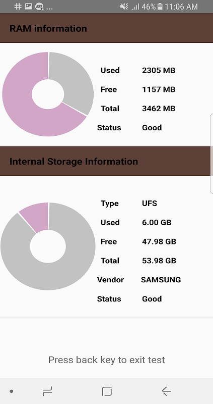 - Es la primera y única aplicación que tiene la capacidad de verificar el fabricante de RAM, el estado de trabajo de RAM (bueno o malo), el tipo de almacenamiento interno (eMMC o UFS u otro tipo), el fabricante de almacenamiento interno (Samsung / Toshiba / SK Hynix), interno estado de almacenamiento (bueno o malo)