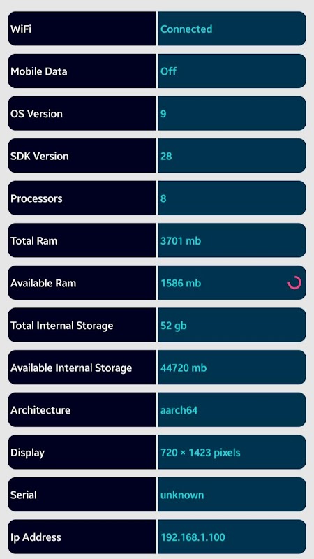 See your Android Device info such as wifi, mobile data, device name, current ip address, screen resolution, sim operator, current country name, language and so on.