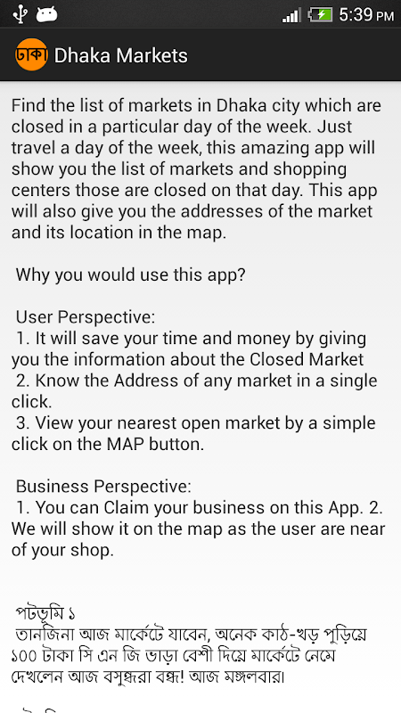 Find the list of markets in Dhaka city which are closed in a particular day of the week. Just travel a day of the week, this amazing app will show you the list of markets and shopping centers those are closed on that day. This app will also give you the addresses of the market and its location in the map.