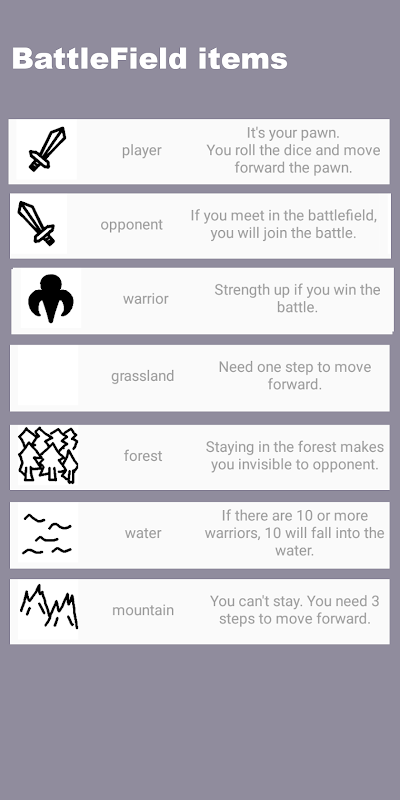Sobre el tablero, se encuentra un campo de batalla con montañas, bosques, praderas y estanques llenos de agua.