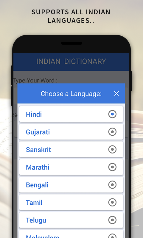 A Dictionary for all Indians no matter what language they speak. This Dictionary will show your the meaning of English word in almost all Indian Languages. Indian Language included are : Hindi, Gujarati, Punjabi, Bengali, Tamil, Telugu, Malayalam, Kannada, Oriya, Marathi, Sanskrit. All in one.