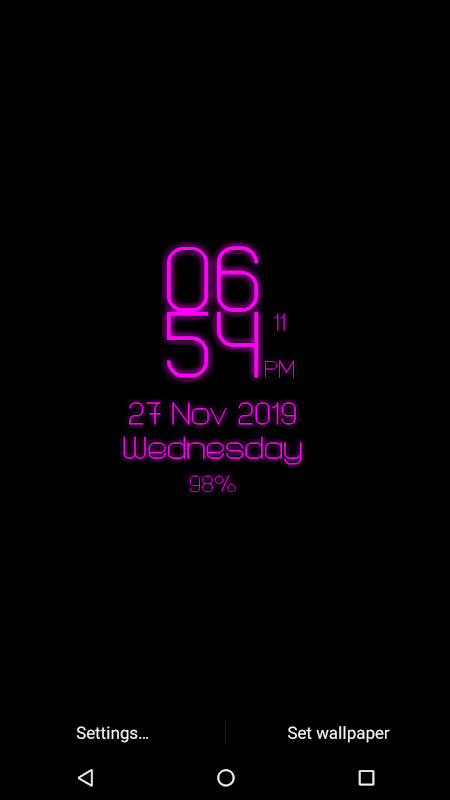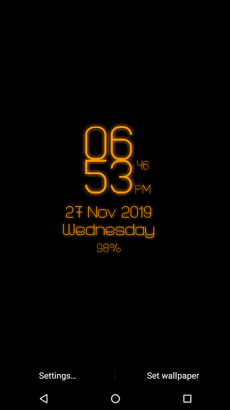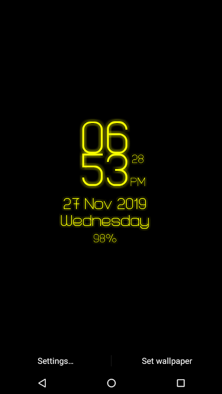 Digital Clock Live Wallpaper - Digi Clock muestra la fecha, hora (12 horas y 24 horas), batería Porcentaje en porcentaje en la pantalla del teléfono con estilo digital con formato simple. el tiempo también muestra formato de 12 o 24 horas según su elección, también agregamos tanto formato de fecha como desee seleccionar si no necesita ningún indicador como segundos, batería, fecha, así que solo seleccione ocultar y no mostrar en la pantalla. Puede elegir el color del reloj con el color Piker y dos estilos de reloj, solo seleccione el estilo del reloj.