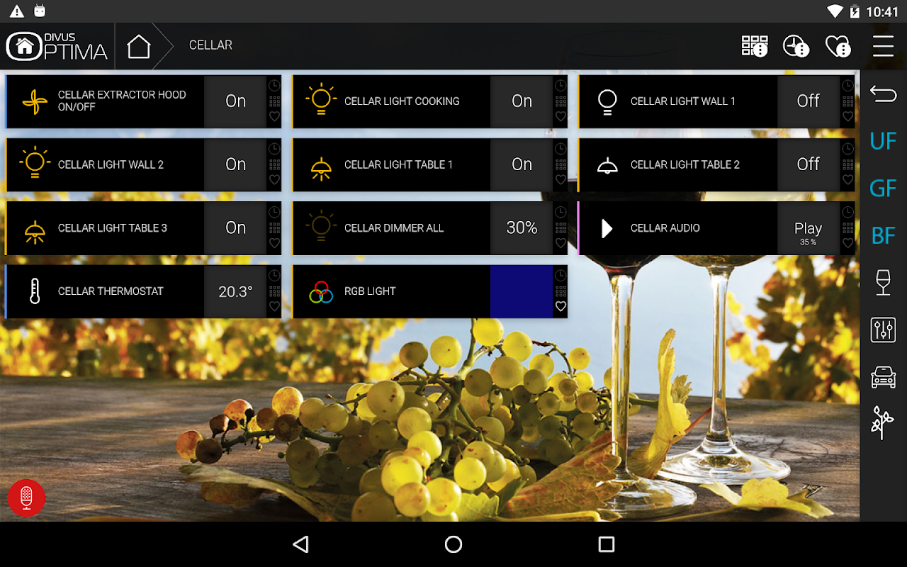 La sencilla interfaz de la aplicación DIVUS OPTIMA le da fácil acceso a todas las funcionalidades de su sistema. No sólo es posible el control de la luz, sino también el control, el riego, los escenarios, las funciones de obturación, la gestión energética de climatización y mucho más puede ser fácilmente administrado de forma remota.