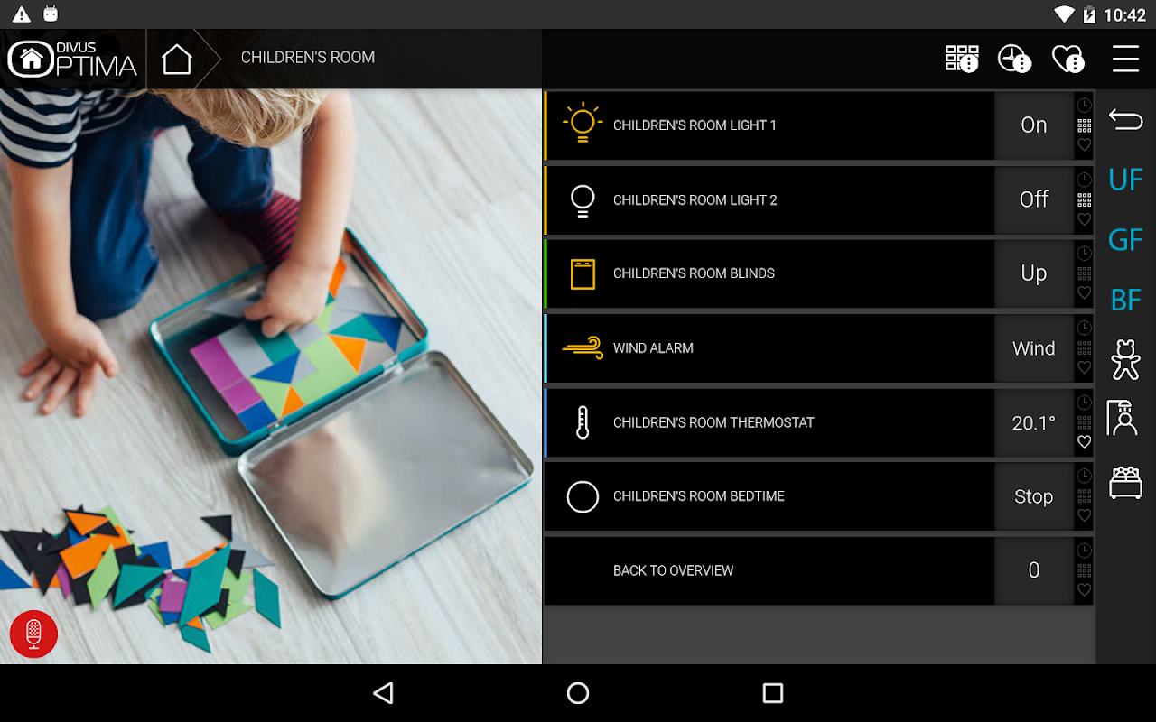 Con DIVUS OPTIMA móvil se puede controlar el sistema de automatización del hogar, incluso cuando usted está en el camino. Utilice su dispositivo Android con el fin de supervisar y controlar las funciones de su casa a través de Wi-Fi o red móvil. La aplicación actúa como software de cliente que se conecta a su dispositivo DIVUS KNXCONTROL y por lo tanto le da acceso a su sistema KNX.