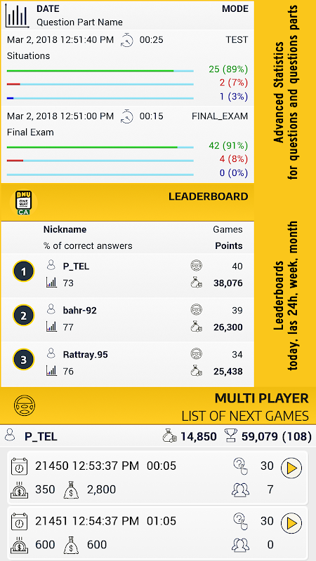 The first and only one game which allows you to compete with other players. Bet your coins, answer questions - climb up in ranking, check your last game results or daily/weekly/monthly leaderboards. No more boring learning.