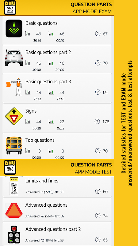 There are several ways to do it. Most users begin with the practice mode and browse through incorrect answers. Then they move to take the tests in the test mode ), which is designed to identify weak points and improve performance. If you don't have any questions left in the test mode, take an exam from each part at least 3-5 times. If you score at least 80% from each part - you are ready to take your final exam. Take it at least 10 times scoring no less than 80% at each time and your DMV exam will be a piece of cake.