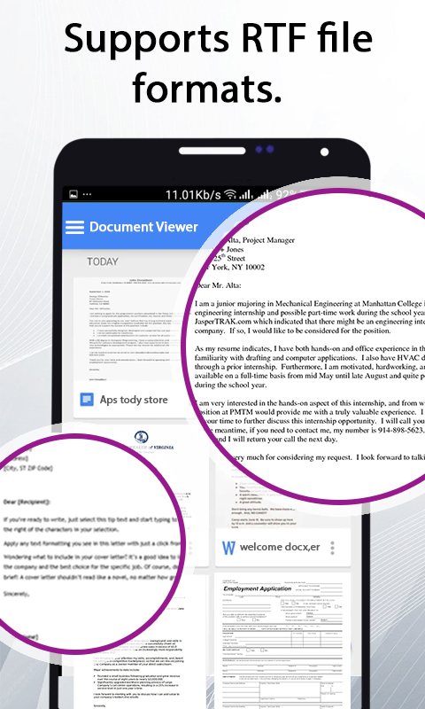 puede abrir todo tipo de documentos y casi todos los archivos de texto, incluidos los archivos power point y pptx, para ver sus presentaciones basadas en power point. prepare sus documentos con el mejor lector de documentos: lector de pdf y office docs reader.document reader: todo tipo de lector de archivos. Ahora puedes tener tus hojas de cálculo de Excel en tu teléfono Android fácilmente. esta aplicación le permite ver documentos pdf fuera de línea y otros archivos como archivos word docx. Esta aplicación puede darle la facilidad de documentos de lectura más fácil. Es una aplicación de lectura de documentos para tu teléfono. puede usarlo como lector de documentos de su oficina y también los estudiantes pueden instalar esta aplicación para usar y ver las diapositivas de power point en el teléfono. Word Office documentos de lectura y visualización. ahora puede explorar todos sus archivos si son archivos txt o cualquier otro archivo xls / csv / ppt / excel que todos puedan leer fácilmente en su teléfono móvil. La aplicación Visor de todos los documentos es una aplicación de lector de archivos muy experta para su teléfono Android.