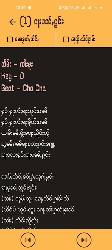 Además, la aplicación también admite la función Modo de lectura, lo que significa que puedes apagar la canción para ver la letra con mayor claridad. Simplemente desactive el menú ၽုၺ်ႇသႅင်ၵႂၢမ်း (Canción de Enalbe) desde los elementos del menú superior derecho. Creemos que también será de gran ayuda para aquellos que quieran leer sólo la letra sin más molestias, especialmente para los cantantes que van a cantar canciones de Dok Su. Además, hemos agregado una función importante para Guitarristas. Se llama ၼႄၶွတ်ႇတိင်ႇ (Mostrar acorde Giluitar). Como se sugiere, al habilitarlo se mostrarán los acordes de guitarra tanto en LyricView como en MediaView. Esto es para ayudar a los guitarristas que van a tocarlo.