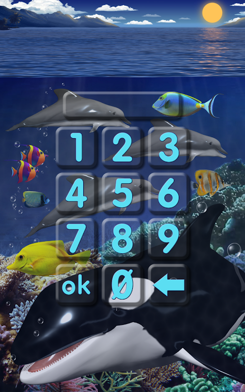 Delfines y orcas pantalla con efectos generados en el Open GL bloqueo. Delfines y orcas bloqueo de pantalla es una aplicación divertida y libre para fines de entretenimiento. Puede utilizar la aplicación para bloquear la pantalla del teléfono. Delfines y orcas bloqueo de la pantalla es muy fácil de usar. Puede elegir entre una cremallera de bloqueo o PIN. Dentro de la aplicación se encuentran hermosas fondos del mundo submarino.