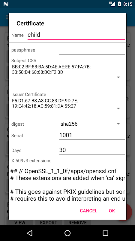 * extensiones personalizadas X.509v3 (vea openssl.cnf)