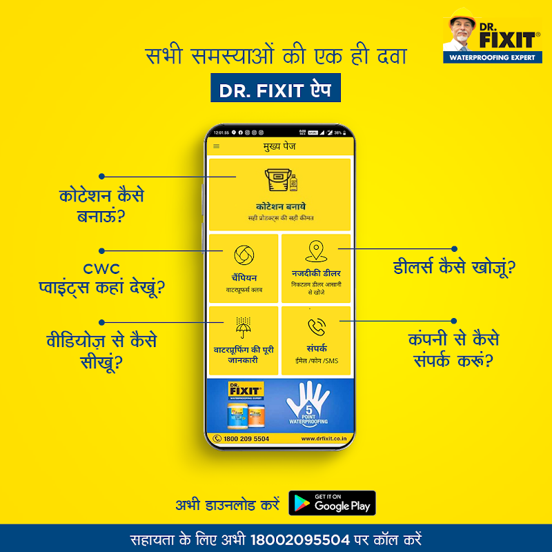 Dr. Fixit App is a tool that puts all waterproofing information at your tips. This app is created to empower and enable our users to implement best waterproofing solution and gain benefits.