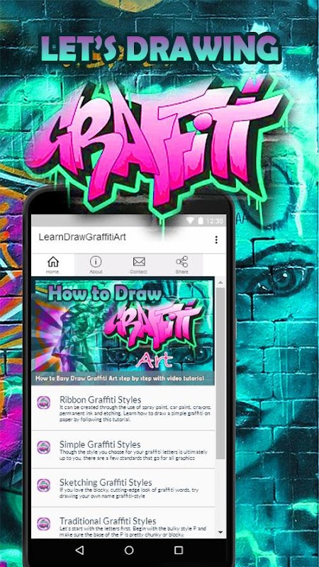 For all Super Drawing Graffiti Art Fans! Have you ever thought to drawing Graffiti?, If you answered yes, you are in the right place to offer you an exclusive FREE application "How to Easy Draw Graffiti Art step by step with video tutorial". This Apps is a step by step instruction which will teach you How to Draw Graffiti for beginners. Like a personal art teacher, it will teach you how to draw Drawings (Step By Step) of different pictures. It includes a large collection of drawings classified by level of difficulty. just take a paper and a pencil, choose the Graffiti you like and follow step by step instructions. It is very easy to use.