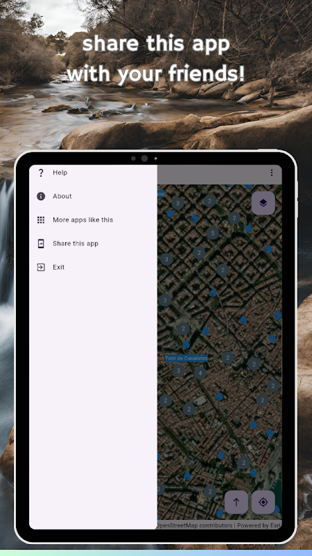 Utiliza datos públicos de OpenStreetMap para mostrar un mapa con las fuentes de agua marcadas. Puede centrar el mapa en su ubicación GPS actual y la aplicación recordará su última ubicación vista cuando la reinicie. Al tocar una fuente de agua, se abrirá su ubicación en otra aplicación de mapas, como Google Maps.