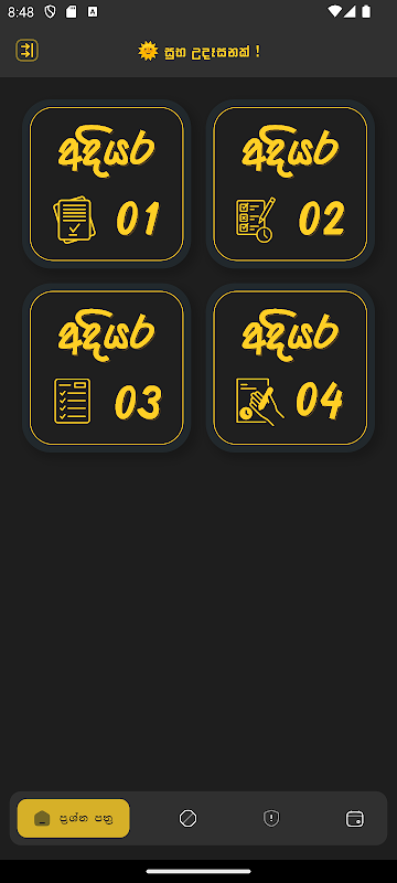 - ප්රශ්න 40 බැගින් සමන්විත අදියර හතරක් ලෙස අඩංගු කර ඇත.