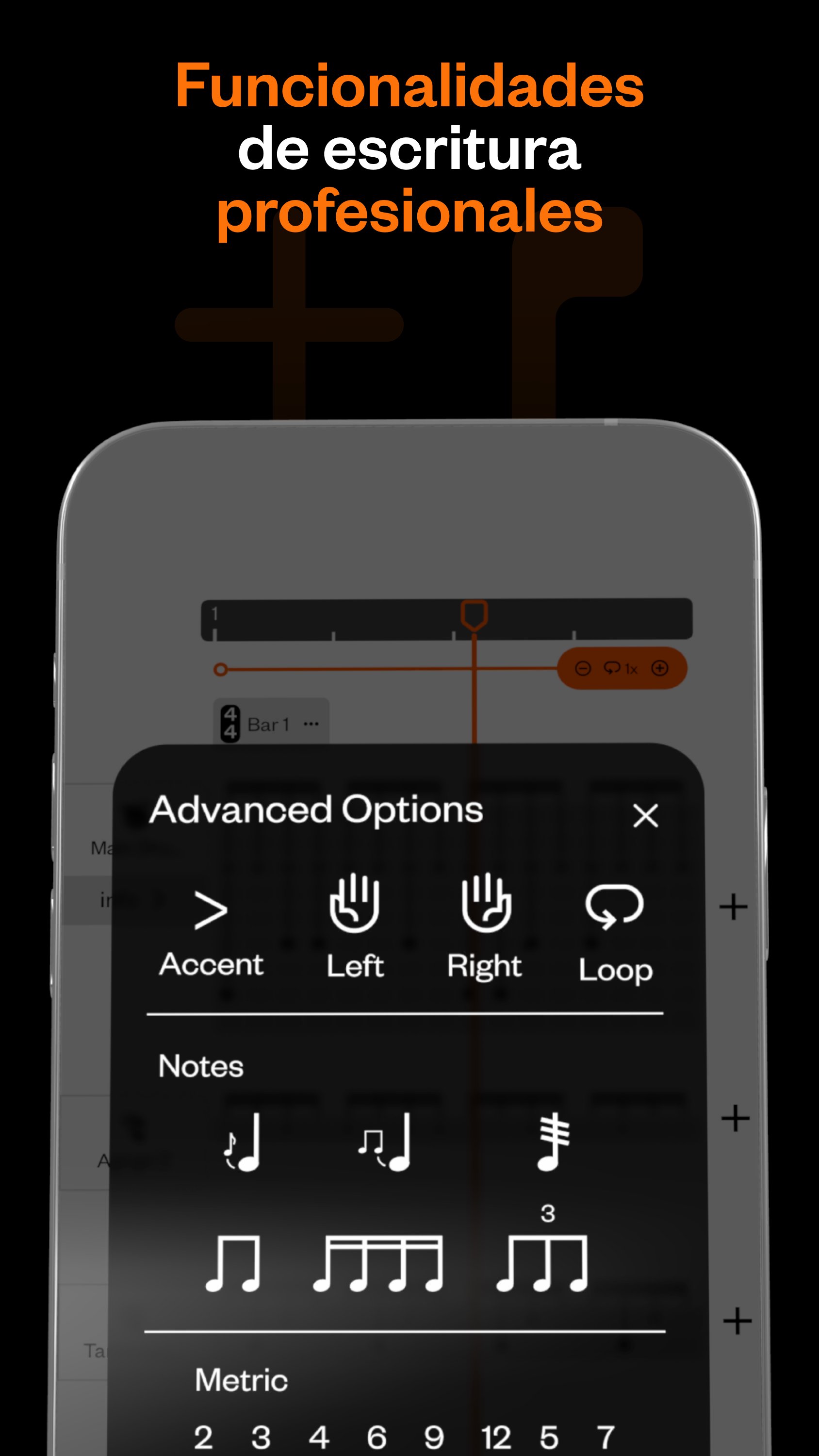 Herramientas de Práctica: Ajusta tu propio metrónomo profesional, personaliza grooves y utiliza el editor de partituras como un entrenador de ritmo.