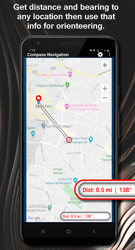 Para ayudar con la orientación con brújula, hay un mapa con herramientas de medición dinámica que le permiten obtener fácilmente el rumbo real y la distancia a cualquier objetivo desde su ubicación actual.