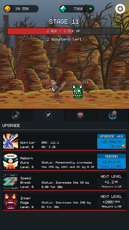 Todas las características inactivas incrementales que ya conoces, con música escalofriante, increíbles gráficos pixelados de la vieja escuela y elementos RPG. Lucha contra monstruos y jefes, recolecta reliquias y sube de nivel a tu guerrero en este épico RPG móvil con batallas automáticas.