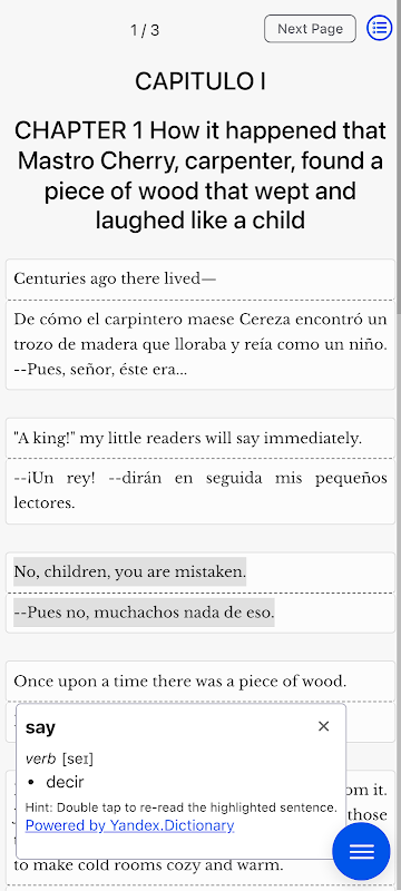 ¡Pase rápidamente entre los textos en dos idiomas a medida que avanza en su dominio del idioma!