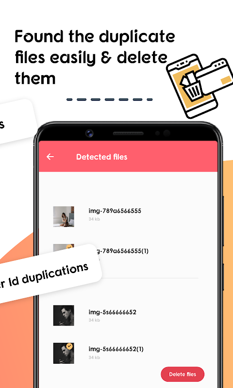 Escanee instantáneamente la memoria de su teléfono y elimine archivos duplicados usando nuestra aplicación Duplicate Photo Remover. En promedio, un 17% de las fotos de su dispositivo son copias idénticas del original, lo que compromete la memoria y el rendimiento del teléfono. Eliminador de archivos duplicados - Buscador de archivos duplicados no solo le permitirá eliminar archivos duplicados, sino que también le permitirá obtener una vista previa de ellos antes de eliminarlos.