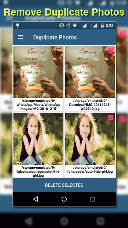 Esta aplicación escanear sus todos los teléfonos para encontrar todos los archivos duplicados y le mostrará en una pantalla. Usted puede elegir de los que uno tiene que quitar y que uno desea mantener. También separar todas las categorías de diferente pantalla diferente para hacer esta aplicación más fácil de usar. Existe la opción de elegir el archivo.