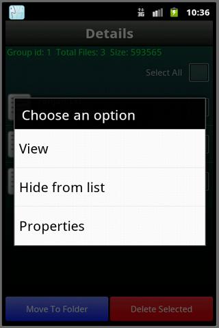 In Results screen, press any button to go to the Details screen where files are listed. Select the check boxes corresponding to the files you want to delete. By pressing the "Delete Selected" button you can delete the files you have selected.