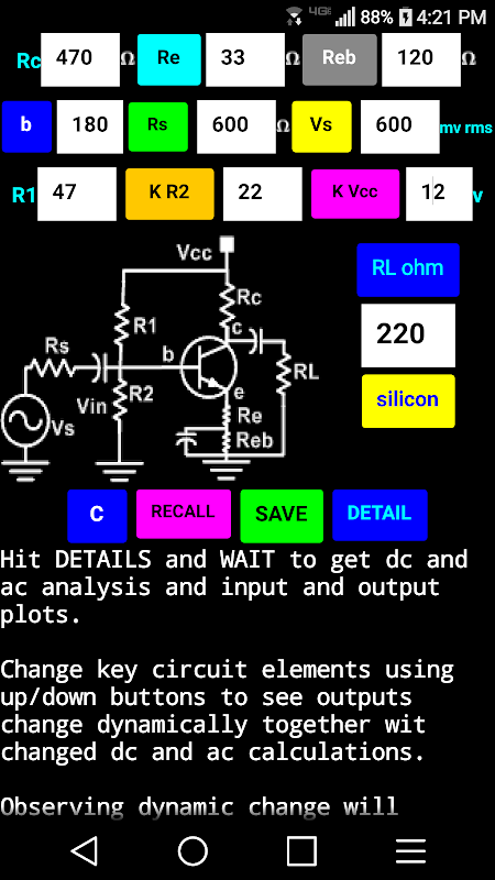 Ver el punto Q y la salida de CA cambian dinámicamente al variar los elementos clave del circuito.