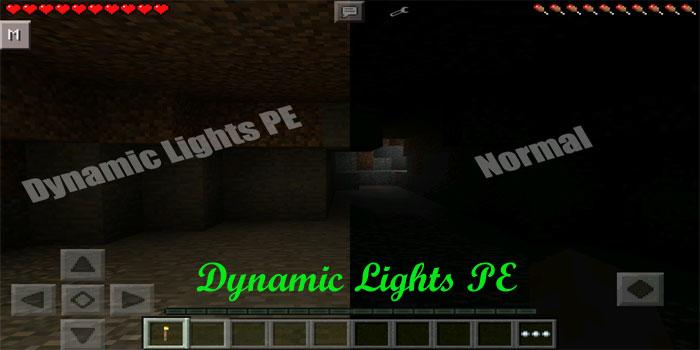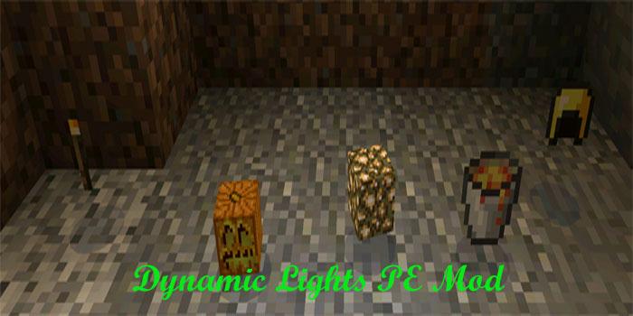 Dynamic Lights PE makes it possible to use torches and a few other items as a light source. Lets say you are in a cave where it’s very dark. All you need to do is to hold one of the five items in your hand to light up the cave. So instead of wasting torches by placing them you can just hold them in your hand to use them as a source of light.