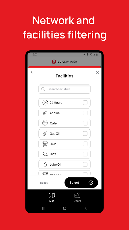 Para una máxima comodidad, la aplicación e-route le permite filtrar resultados según admisión de vehículos pesados de transporte de mercancías, apertura las 24 horas, suministro de AdBlue y también presencia de tiendas exprés.