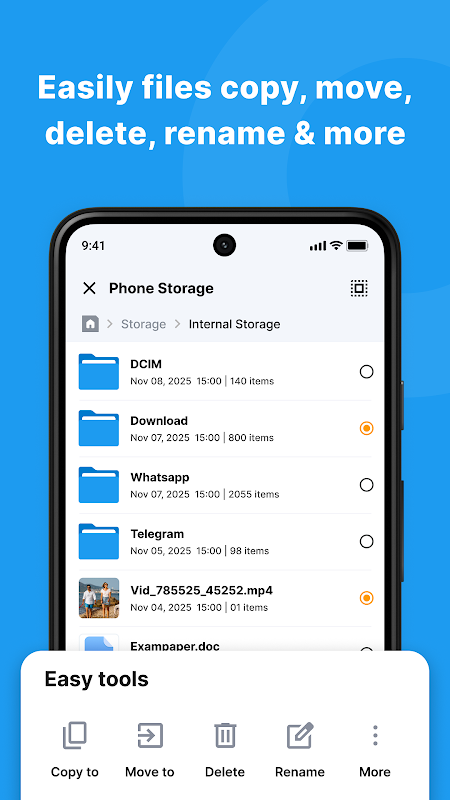 Copia, mueve, elimina, renombra y marca archivos como favoritos fácilmente. Usa la función de ocultar para mantener los archivos privados o muévelos a una carpeta privada con protección por PIN para mayor seguridad, todo en un sencillo administrador de archivos.