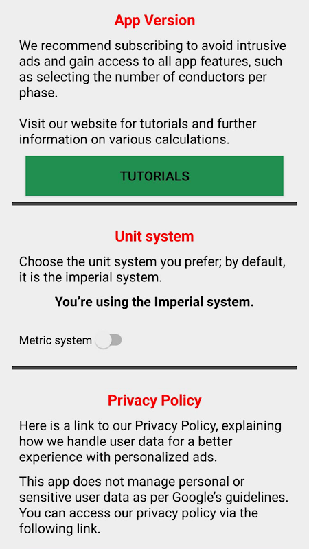 Con esta aplicación, es posible calcular el relleno del conducto, el tamaño del cable, el amperaje del motor, el amperaje del transformador, fusibles, disyuntores, caída de voltaje, tamaño del conductor según la caída de voltaje e incluye una tabla que muestra la capacidad de amperaje de diferentes tamaños de cables de cobre y aluminio. .