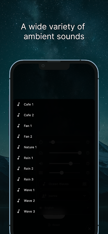 eazynap facilita la Reproducción Cognitiva. Presta atención brevemente a palabras cortas mientras descansas para desconectar de los pensamientos recurrentes. Aplica una capa de ruido ambiental suave o blanco, configura un temporizador y deja que la app te ayude a relajarte por la noche.