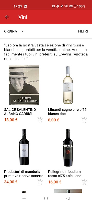 e-bevini tiene un catálogo de más de 4000 etiquetas entre vinos licorosos y espumosos, encontrará principalmente vinos de la región de Campania, e-bevini compra vinos directamente en las bodegas de producción ubicadas en varios lugares típicos de Avellino, Taurasi, Montemarano, Montefalcione, en Beneventano como Solopaca o en Aversa con su típico Asprino d'Aversa....