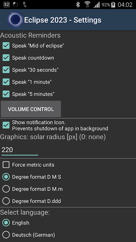 La aplicación le informa sobre los tiempos exactos del eclipse según su posición de red o GPS individual. Le mostrará un mapa con la ruta completa del eclipse, brindándole detalles sobre los horarios y las circunstancias locales. Incluso antes del eclipse, puede ver una animación del evento, ya que se verá desde su ubicación. Cuando el eclipse esté en curso, mostrará una animación en tiempo real del evento celeste. Escuchará anuncios acústicos de etapas importantes del eclipse y verá una cuenta regresiva en su pantalla. Busque su ubicación favorita en una enorme base de datos o en el mapa o simplemente use la posición real de su dispositivo.