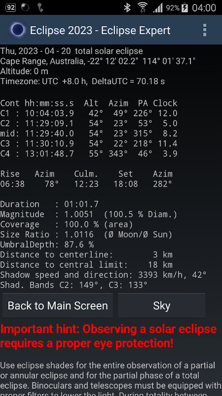 Los astrónomos aficionados comprometidos disfrutarán de una pantalla con información detallada de las circunstancias locales del eclipse.