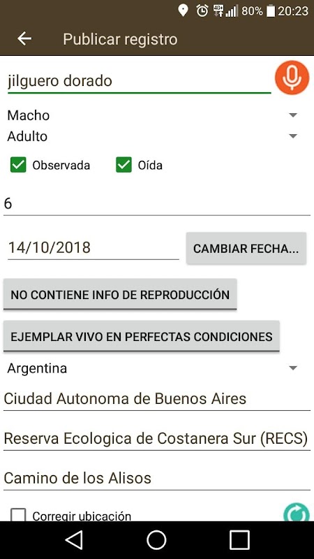Esta herramienta permite publicar nuestras observaciones desde un teléfono celular, de las siguientes clases de animales: aves, insectos, mamíferos, reptiles, peces, arácnidos, anfibios, moluscos y crustáceos. Cuando deseemos aprovechar un viaje en colectivo, una sala de espera o directamente en el campo, podremos cargar las especies observadas/oídas y no esperar a llegar a sentarse en una PC para realizarlo. Para evitar descuidos la APP no permite la edición o eliminación de registros, y esto puede realizarse en el perfil de cada usuario mediante el módulo de "Registros publicados con el celular".