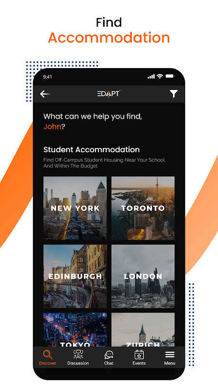 Desarrollada por estudiantes internacionales, la aplicación EDAPT es una solución completa para todos los estudiantes y profesionales que planean estudiar y trabajar en un nuevo país o ciudad. EDAPT les permite construir redes multiculturales digitalmente y les permite explorar alojamientos, universidades, eventos, información y mucho más bajo un mismo paraguas.