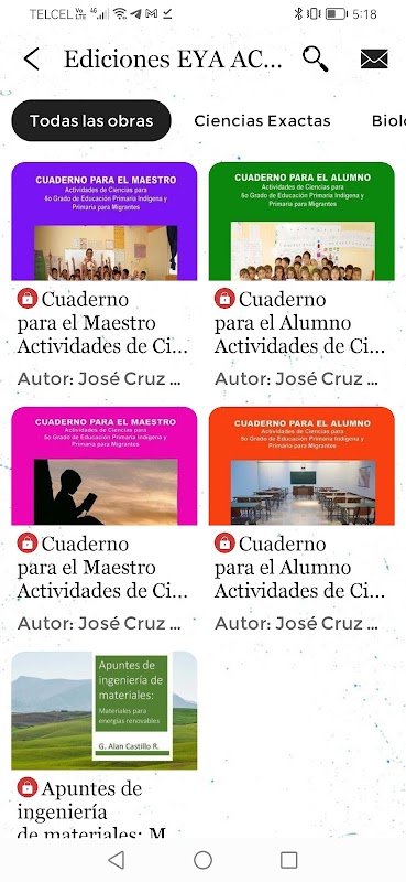 En al categoría de libros, contamos con las secciones de humanidades, biología, ciencias de la salud, ciencias exactas, ingeniería y tecnología.