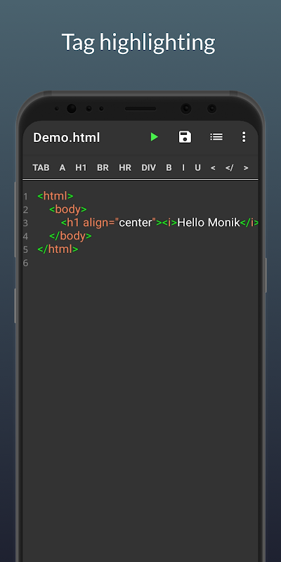 it has all the functionality you can get on Laptop or PC . you can create file , folder or select existing one . write down your HTML code and just click on play button and "wola" your results will be there waiting for you .