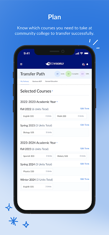 EdVisorly es la ventanilla única para estudiantes que buscan transferirse de un colegio comunitario a una universidad de 4 años. Descubra universidades amigables para la transferencia, conéctese con equipos de admisiones universitarias, planifique sus cursos de colegios comunitarios, solicite ingreso a universidades de forma gratuita y más.