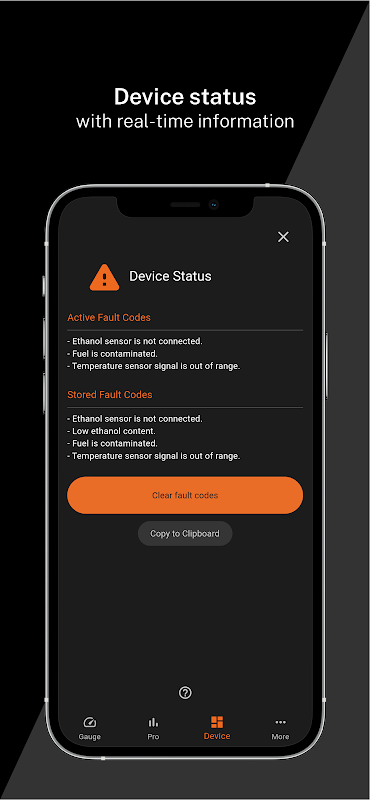 Con eFlexApp puede monitorear su dispositivo eFlexFuel en tiempo real. eFlexApp reconoce la versión de su dispositivo eFlexFuel y ofrece diferentes funciones con cada producto. La aplicación también permite el ajuste de los dispositivos eFlexPlus y eFlexPro. Cambia el idioma (inglés, francés, finlandés), la unidad de temperatura (°F/°C) y el tema (claro/oscuro).